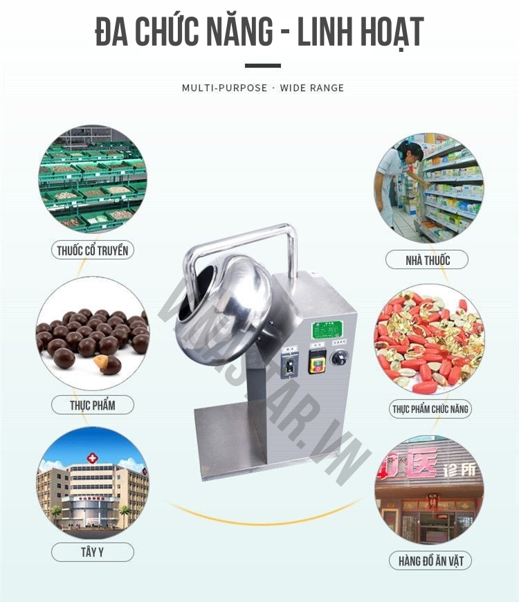 Không chỉ có chức năng bao viên, máy còn có tác dụng bao đường, bao sáp, bao parafin và đánh bóng viên hoàn.