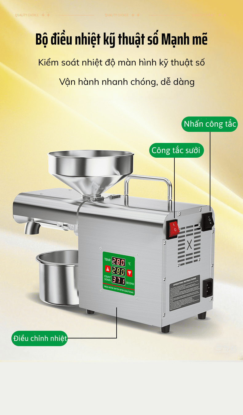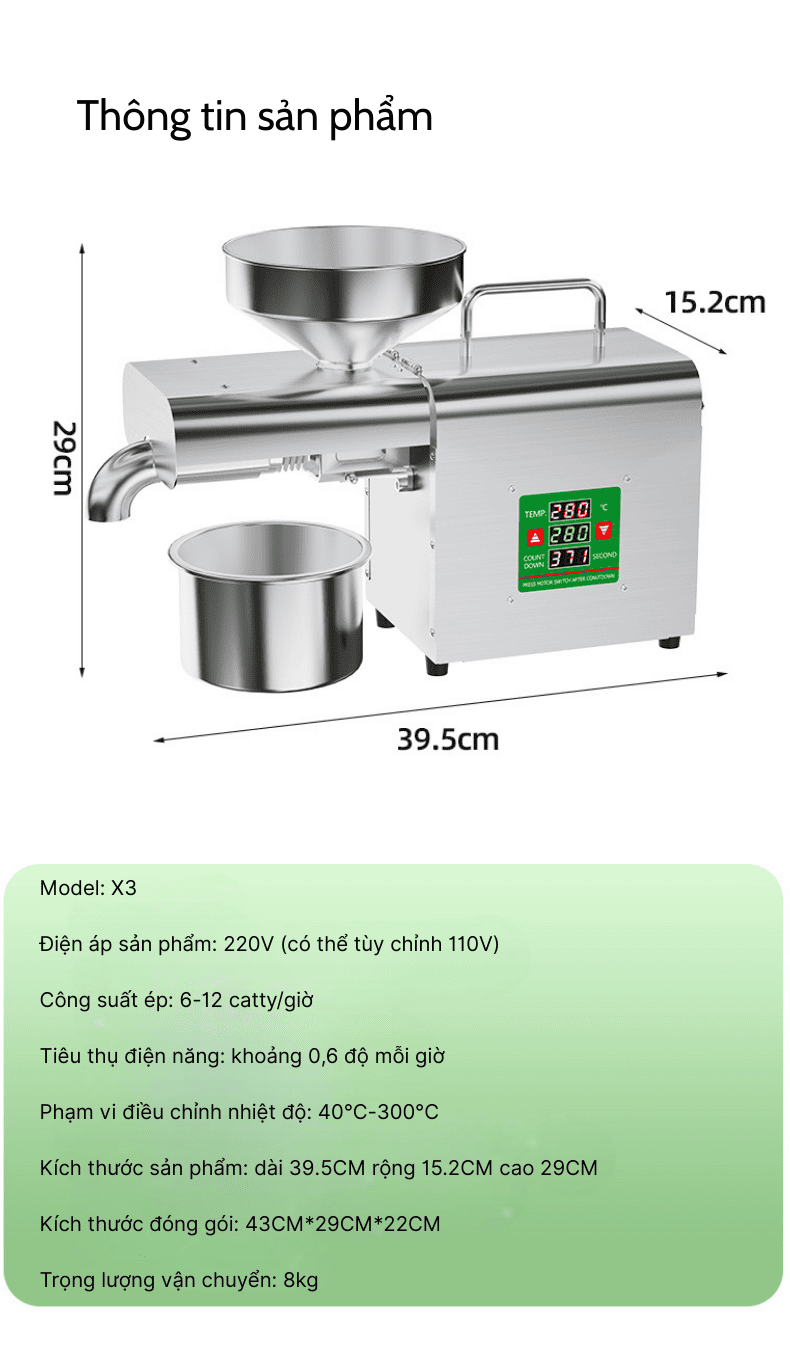 Với những tính năng vượt trội, động cơ không chổi than, màn hình kỹ thuật số hiện đại, điều chỉnh nhiệt linh hoạt và khả năng ép kiệt đến 99%, X3S không chỉ giúp bạn ép ra những giọt dầu vàng óng, nguyên chất 100%, mà còn mang lại sự an tâm tuyệt đối khi dùng cho cả gia đình – từ người lớn đến trẻ nhỏ.