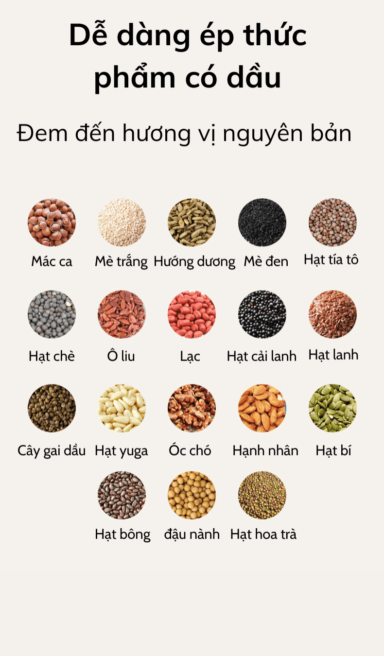 Có thể ép đa dạng hạt như: lạc, mè, hướng dương, óc chó, mắc ca, đậu nành, dừa... mà không cần rang nguyên liệu trước – tiết kiệm thời gian và tiện lợi cho người dùng.