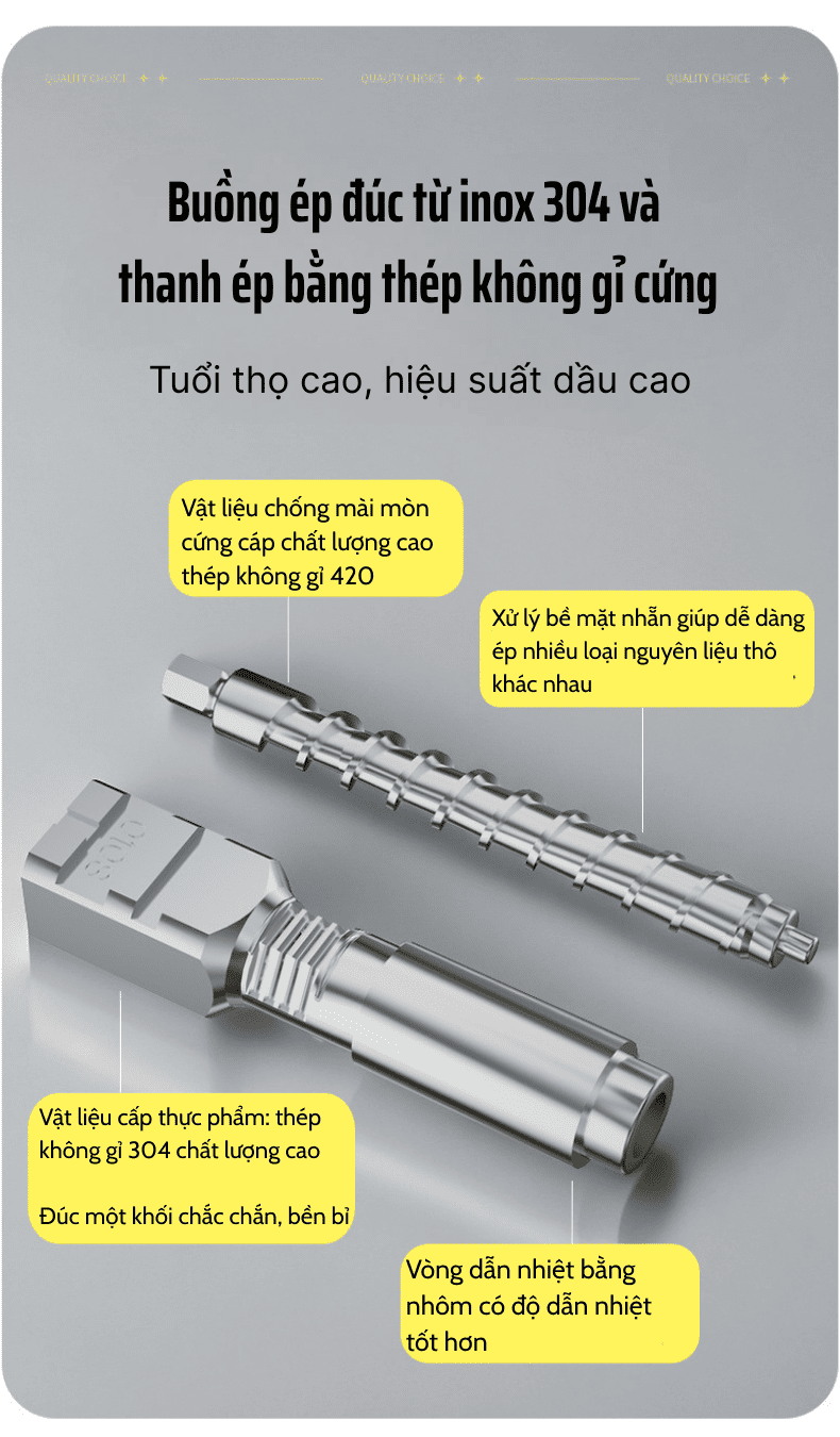 Trục ép bằng Inox 420 thiết kế dạng xoắn tháp, tăng áp lực nén giúp ép nhanh hơn, bã khô hơn, dầu ra tối đa mà vẫn giữ nguyên dưỡng chất.
