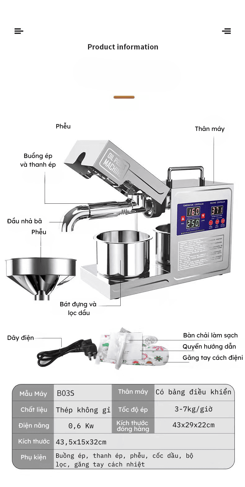 Với mức giá hợp lý, công suất ổn định và chất lượng dầu ép vượt trội, máy ép dầu B03S là lựa chọn hoàn hảo để bắt đầu lối sống chủ động và lành mạnh. Thiết kế tối ưu, tiện dụng, dễ bảo quản giúp máy trở thành trợ thủ bền bỉ trong gian bếp hiện đại.