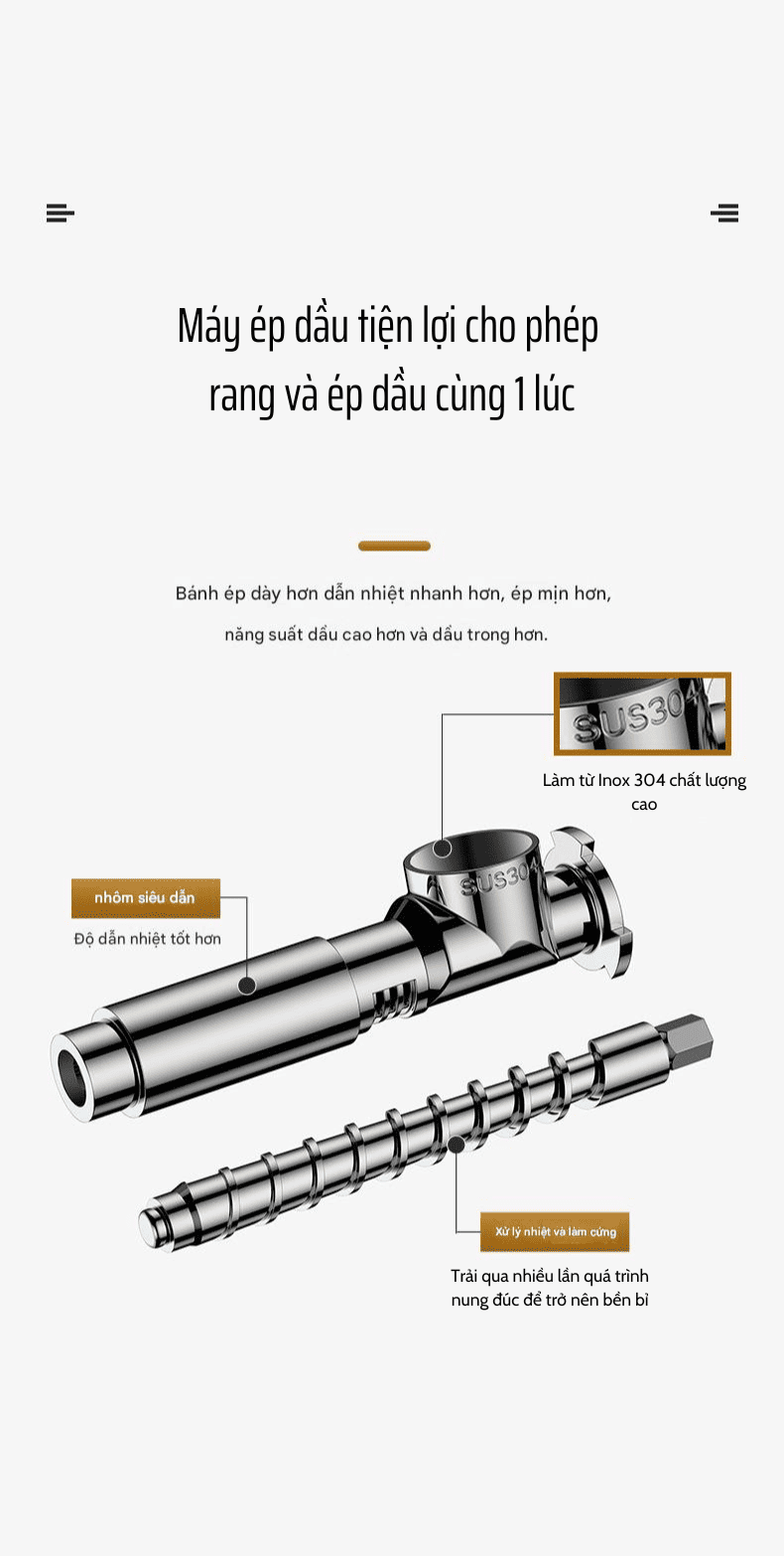 Trục ép: Dài 210mm – thiết kế xoắn thông minh, ép nhanh, kiệt dầu