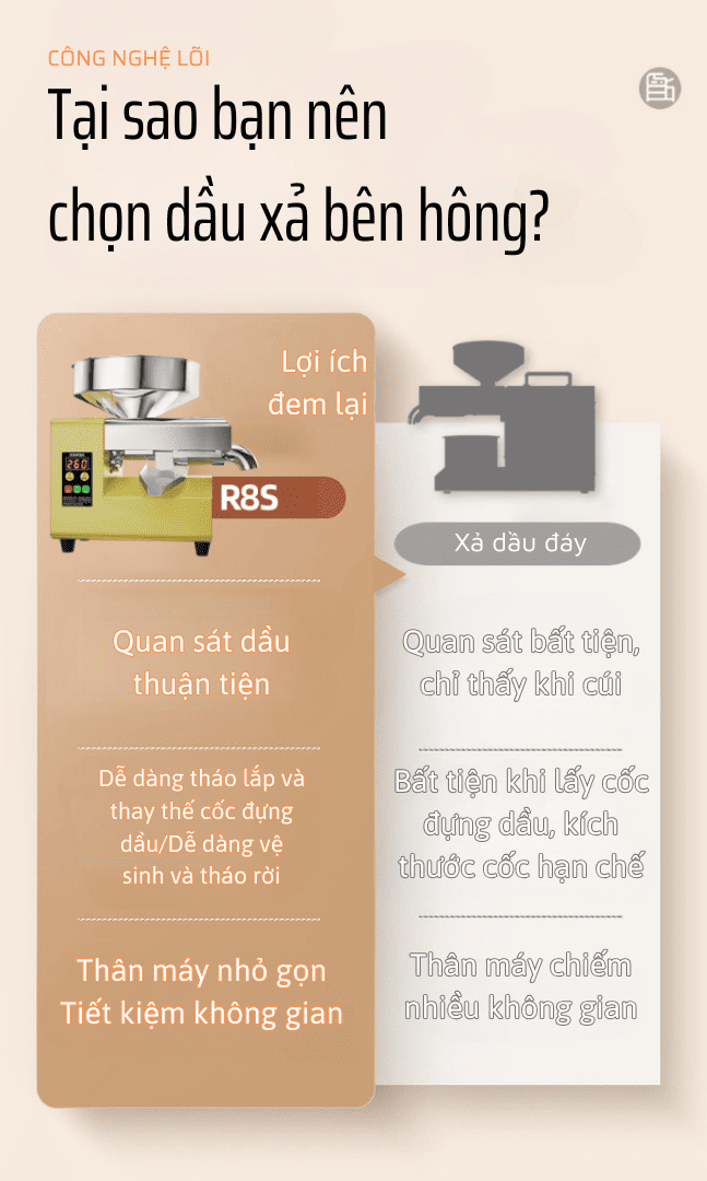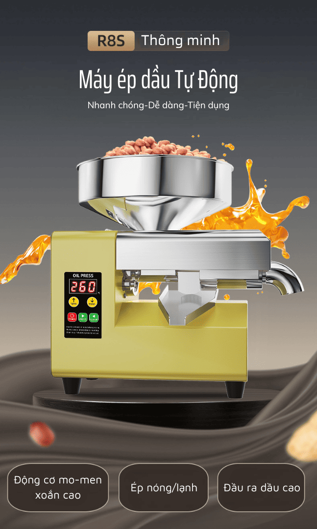 Giữa thị trường thực phẩm ngày càng phức tạp, người tiêu dùng đang dần chuyển sang xu hướng tự ép dầu tại nhà để kiểm soát chất lượng, độ tinh khiết và giá trị dinh dưỡng trong từng giọt dầu ăn. Và nếu bạn đang cần một thiết bị vận hành mạnh mẽ, thông minh, tiết kiệm thời gian nhưng vẫn đảm bảo tối đa hiệu quả, thì máy ép dầu gia đình R8S chính là lựa chọn đáng cân nhắc.