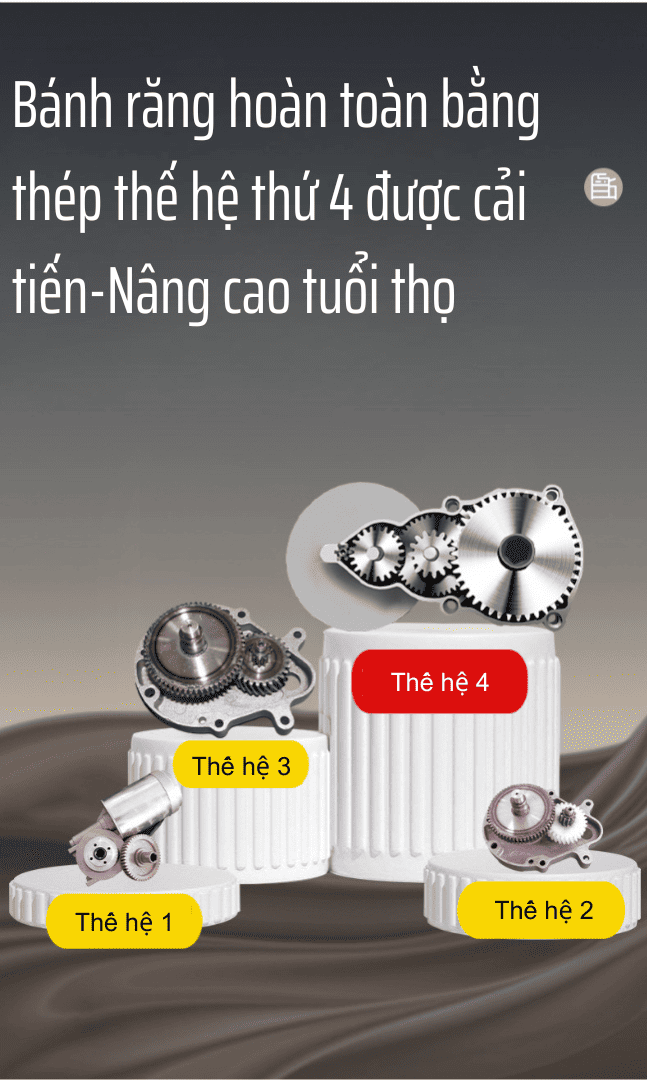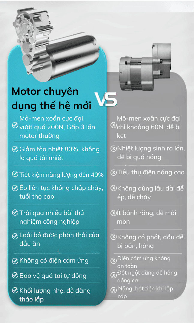Mô-tơ không chổi than 1100W kết hợp hộp số và bánh răng thép thế hệ 4 – giúp máy vận hành êm, ép liên tục 24 giờ/ngày mà không nóng máy.