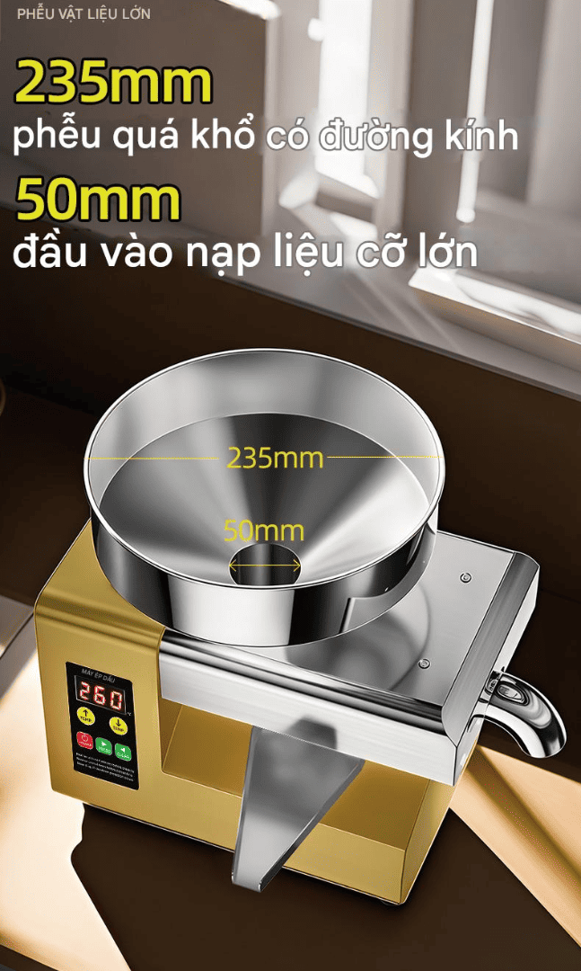 Phễu nguyên liệu rộng tới 235mm, miệng nạp đường kính 50mm – tiếp nguyên liệu nhanh, không bị kẹt.