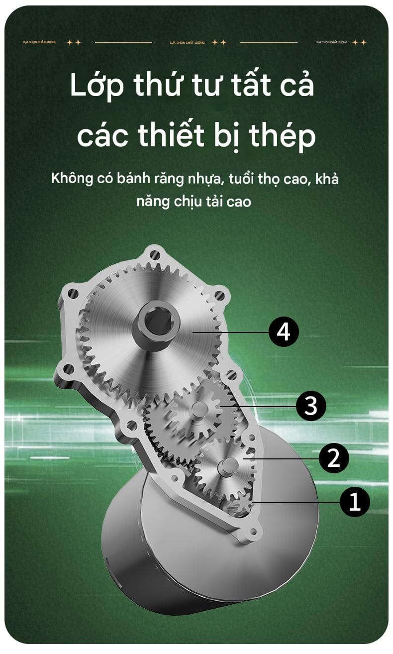 Tích hợp bánh răng thép truyền động – chất liệu chuyên dùng làm nhíp ô tô, bền vượt thời gian.