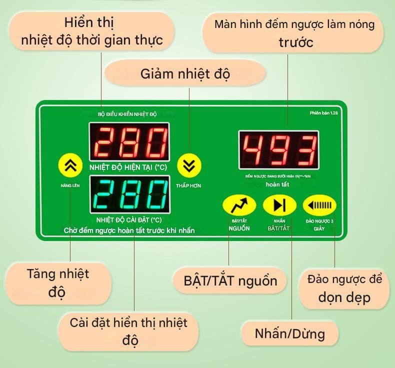 Màn hình kỹ thuật số hiện đại, giúp theo dõi và điều chỉnh nhiệt độ dễ dàng trong phạm vi từ 40ºC – 300ºC.
