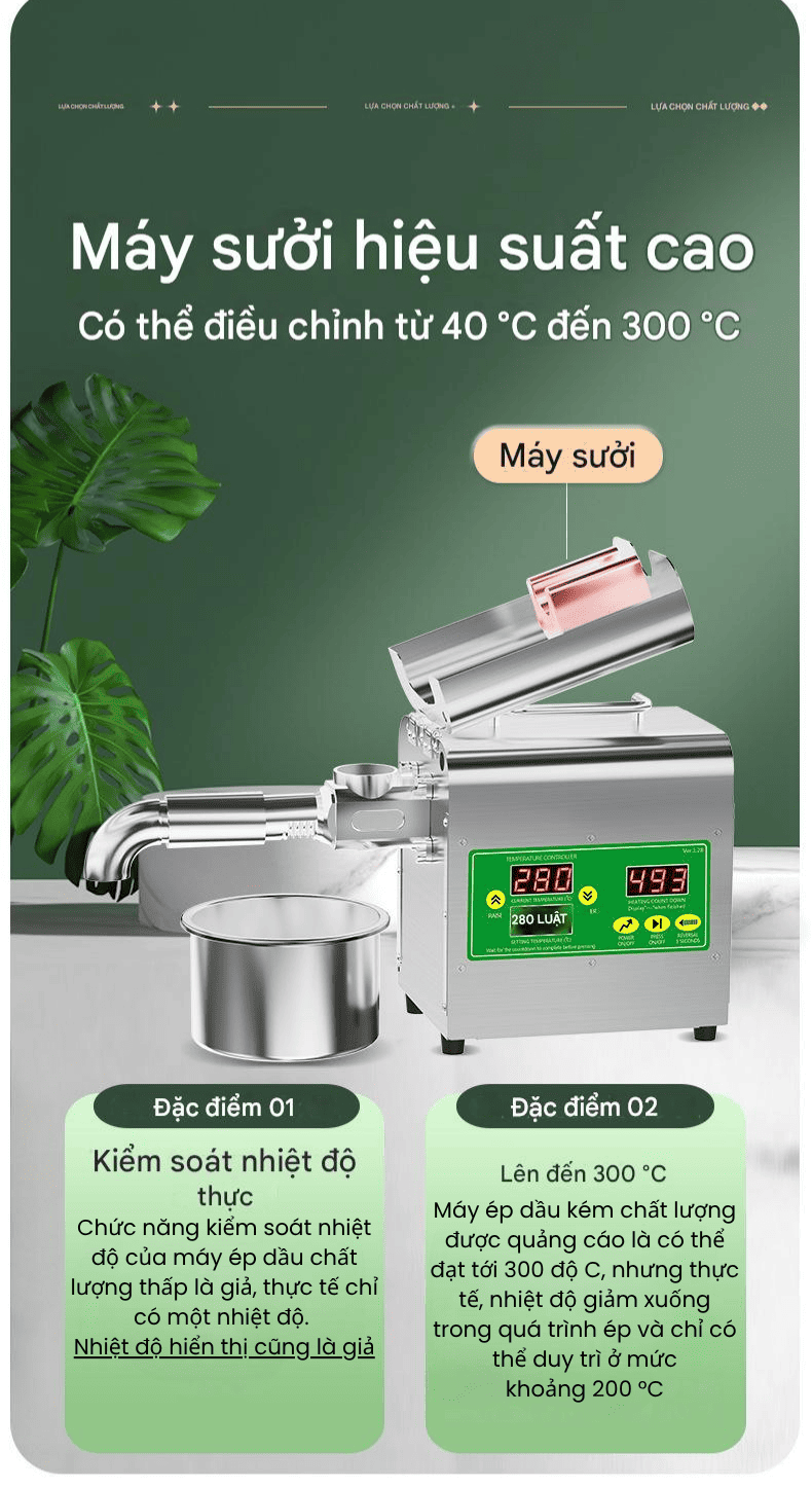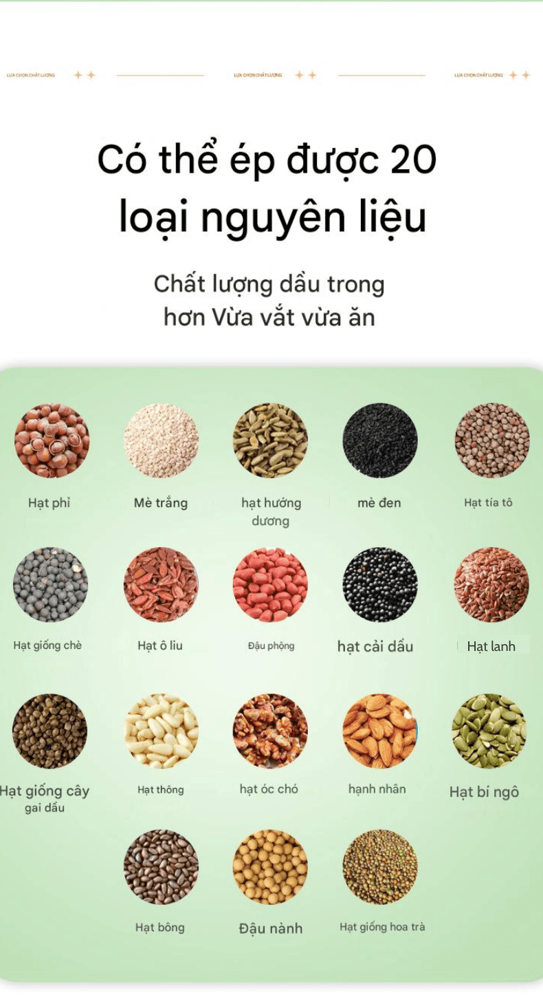Bạn có thể sử dụng máy hằng ngày để tạo ra dầu ăn, dầu dưỡng tóc, massage, hoặc dùng cho mục đích chăm sóc sức khỏe toàn diện. Đây là thiết bị không thể thiếu nếu bạn đang hướng tới lối sống xanh, sạch và an toàn cho cả gia đình.