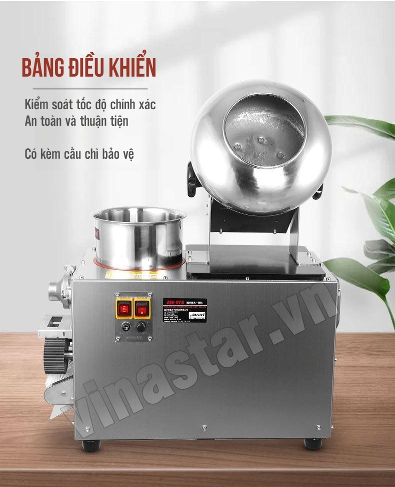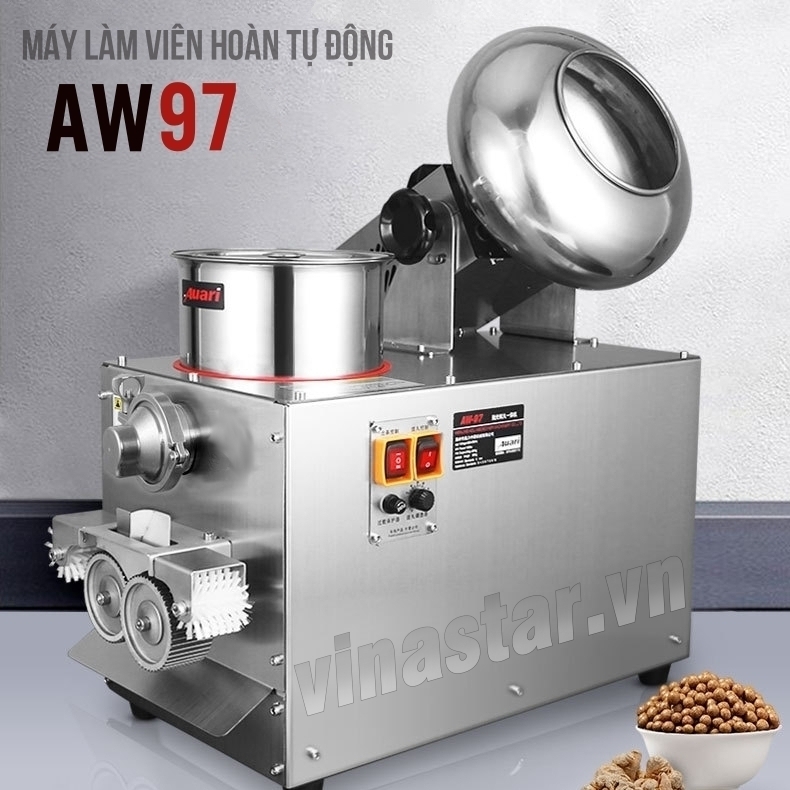 Máy làm viên hoàn AW-97 là bước đột phá về công nghệ trong gia đình máy làm viên hoàn của chúng tôi. Được tạo ra với đầy đủ các chức năng nhằm giải quyết nhu cầu tự động hoàn toàn từ khâu nhào trộn nguyên liêu cho đến vo viên, đánh bóng và hong khô thành phẩm. Chỉ với một chiếc máy quý khách sẽ sở hữu trong tay một dây chuyền mini phục vụ từ A đến Z, không cần phải vất vả nhào bột bằng tay một cách thủ công hay phải mua thêm máy trộn bột cồng kềnh nữa. Tất cả những gì bạn cần làm là chuẩn bị tỉ lệ nguyên liệu theo ý thích rồi sử dụng máy để cho ra thành phẩm đều như vắt tranh, viên nào viên nấy tròn tăm tắp.